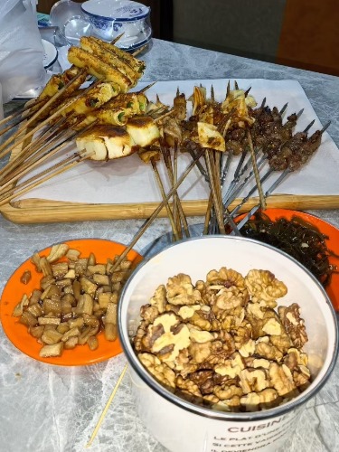 烤肉,干果,羊脖子肉和手抓饭,羊肉汤。
