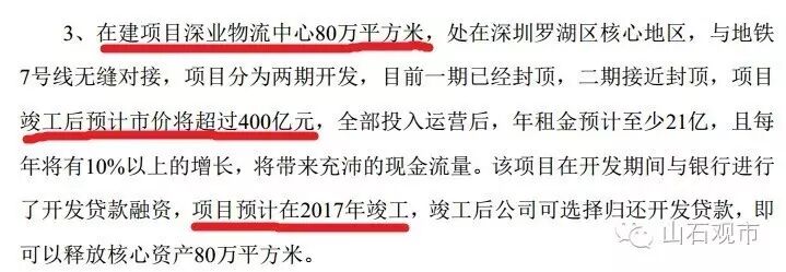 其中,在建项目深业物流中心80万平方米物业,一期今年竣工,全部预计明年投入运营。项目竣工后预计市价将超过400亿元,全部投入运营后,年租金预计至少21亿,且每年将有10%以上的增长,将带来充沛的现金流量。