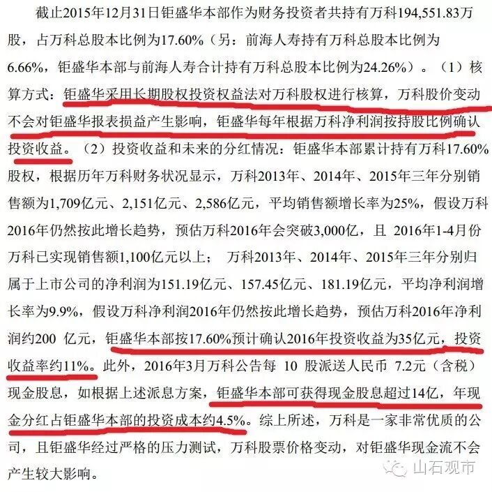 钜盛华采用长期股权投资权益法对万科股权进行核算,万科股价变动不会对钜盛华报表损益产生影响,钜盛华每年根据万科净利润按持股比例确认投资收益。钜盛华本部按17.60%预计确认2016年投资收益为35亿元,投资收益率约11%。