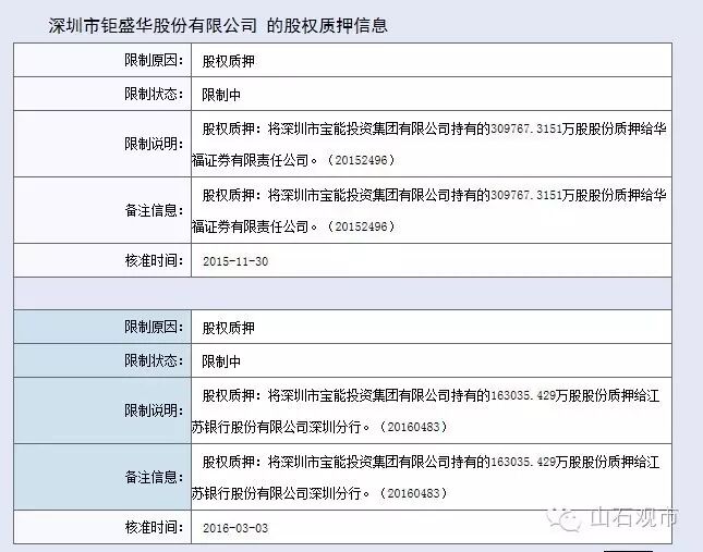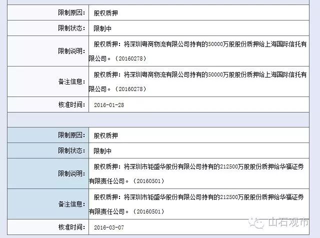 相关工商资料显示,今年3月3日和3月7日,姚振华先后累计向江苏银行深圳分行和华福证券质押37亿股钜盛华股份。