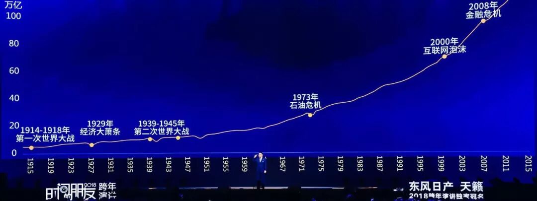 你能看到第一次世界大战、1929年全球经济大萧条、第二次世界大战,还有石油危机、2000年互联网泡沫、2008年金融危机……你看,当一些大事发生的时候,经济的发展会受影响,短期的波动会有,但是一个鹞子翻身就接着往上走。你何尝见过倒栽葱式的陡然下滑?