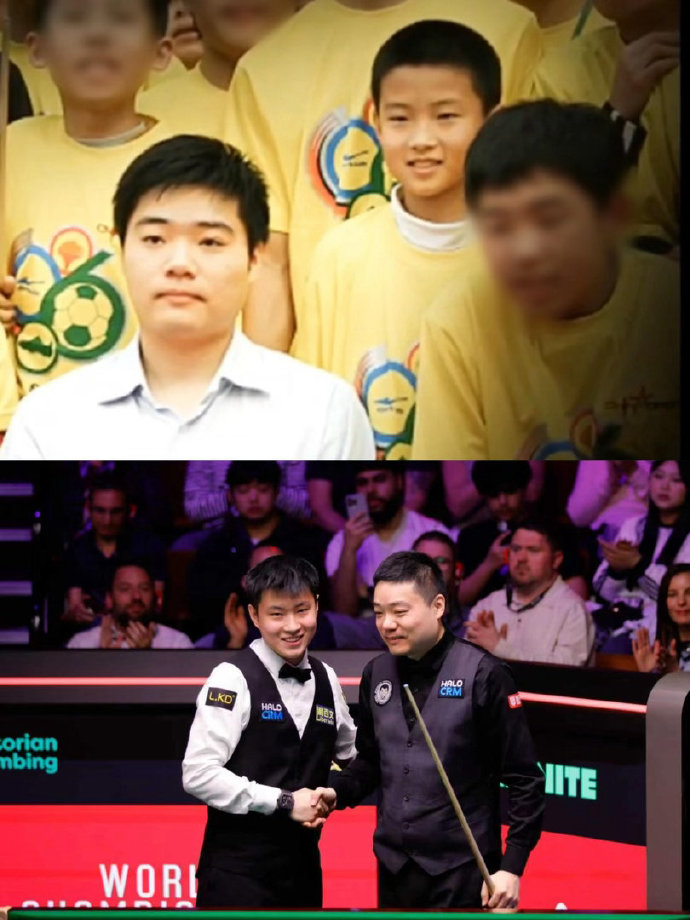 当然直播解说的是赵/丁大战,他们前面16场较量我已经看过,相当精彩,两人你一局我一局,一直打到5-5,两人的长台成功率高达93%-86%,赵心童更强一些。随着时间的延长,丁俊晖失误增多,前二节以9-7落后。这场直播,丁俊晖面对新科世界冠军,更显示出疲态,有好几局球,都是在5-60分,再进1-2颗红球就超分的形势下失误,被赵心童反超,结果全局13-9被淘汰出局,事后赵心童发了两张照片向丁俊晖致敬,其中一张是少年的他正好站在丁俊晖后面,下决心打斯诺克争取成为丁俊晖那样: