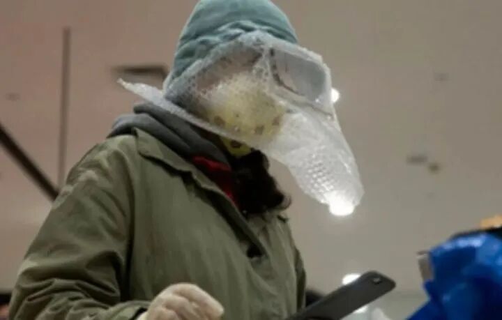 在我老家布鲁克林的医院,护工志愿者们只能这样防护自己。他们已经开始向民众求助募捐口罩和防护服。