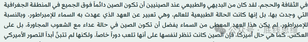 这部分内容的原文截图上述阿语译文,在《论中国》的英文原文是什么呢?是:“ That the Chinese Empire should tower over its geographical sphere was taken virtually as a law of nature, an expression of the Mandate of Heaven. For Chinese Emperors, the mandate did not necessarily imply an adversarial relationship with neighboring peoples; preferably it did not.”