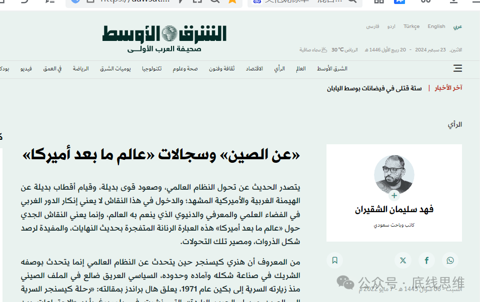 该文章截图2022年,阿语《中东报》上,沙特专栏作家沙吉朗在《〈论中国〉与关于“后美国时代之世界”的争论》一文中,摘录了基辛格《论中国》第一章的阿拉伯语版的片段,包括:“对于中国人来说,在与其共存的那片地理区域内,中国始终高于其他所有群体,那是不言而喻的和自然的,那根本就是世界的自然状态,并且它还体现了一项诺约,即天委托(ahidat)皇帝的诺约(ahd)。对于皇帝来说,这一由天赐送的诺约倒是并不希望中国与邻国人民持敌对状态,而是相反。”(据文章中的阿语行文翻译)
