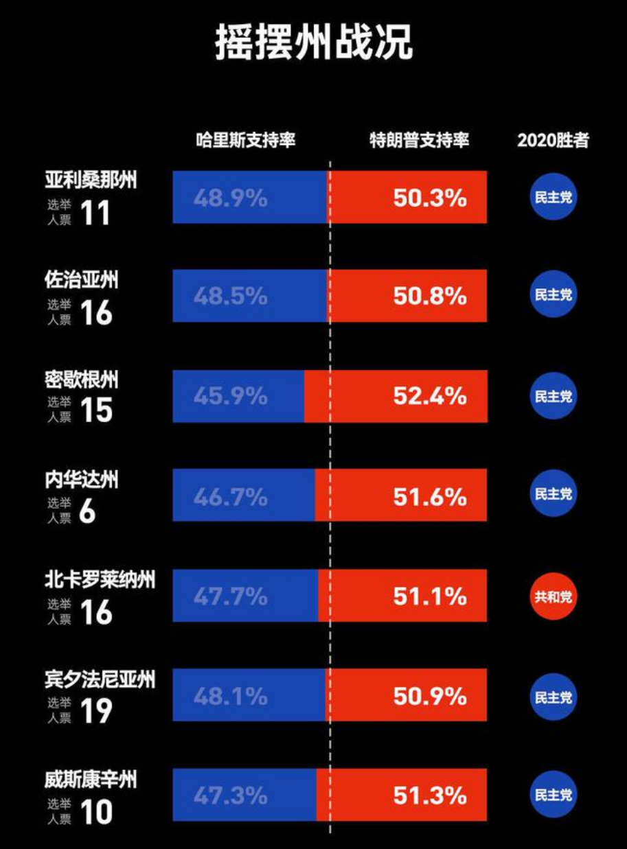 NBC電視台的一項民調顯示,在2024年,70%的拉丁裔選民對經濟現狀感到不滿。偏偏7個“搖擺州”正是拉丁裔的聚居區。他們或許不喜歡特朗普的一些過激言論;但只要“經濟牌”對胃口,拉丁裔選民,尤其是其中的男性,還是會果斷選擇特朗普。