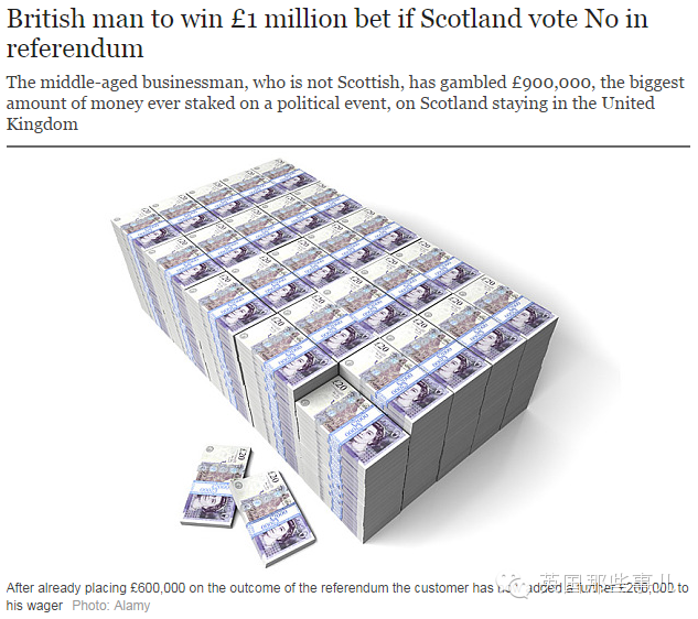 各種賭徒也high了起來,一個英國人居然押了90萬英鎊堵住在獨立失敗上….. 成為英國政治事件投注的最大賭注額…. 不過這次獨立失敗的賠率不高啊,就是他贏了也只能拿回109萬英鎊。。萬一獨立成功了。。。。。。