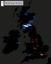 至於現在英國投票的情況?有人把推特上【蘇格蘭獨立公投】的Yes和No為關鍵詞製作出的可視化動態圖。效果各種炫酷啊!