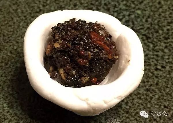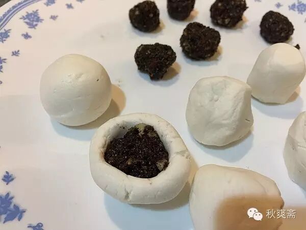 炒香了用研钵舂碎一尝,好像还真是那个味道! 于是混了芝麻,核桃,杏仁,花生,加些红糖和花生油,做成五仁馅: