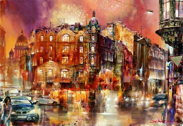 Ivan Slavinsky也是列宁格勒出生的,1968年,和Mstislav Pavlovy一前一后。他母亲是列宁格勒小有名气的画家和美术史专家。他算超现实主义和印象派画家。可能受到苏联时代社会主义现实主义的“约束",他这个超现实主义和Salvatore Dali可是太不一样,要现实得多了。风格热烈,富于戏剧性,特别爱用大片的红色。