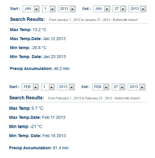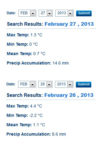 比较一下两个月各27天的降水量,2月91.4mm几乎是1月49.2mm的两倍了,而这差不多是去年同期的三倍(去年2月的总降水量只有31.8mm),可见今年2月的降雪确实不少。
