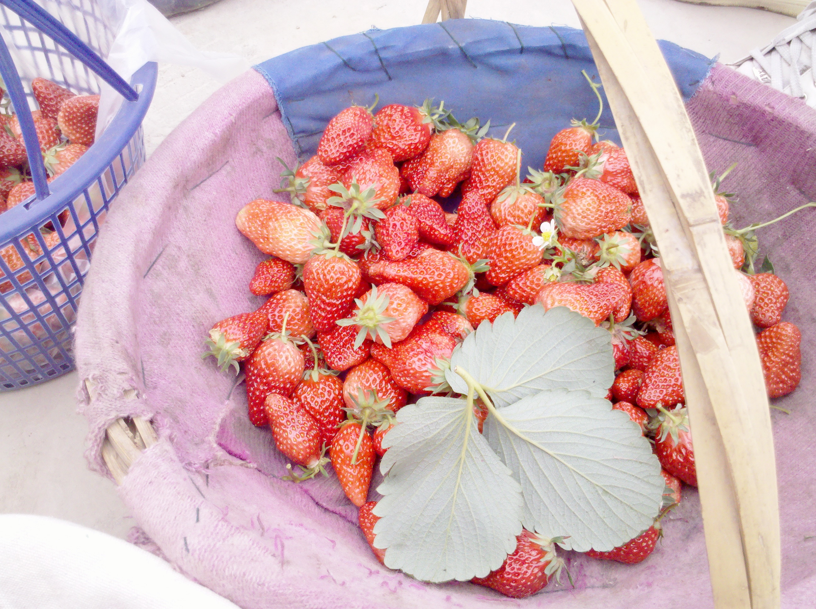 据招待我们的农户介绍,现在属于刚刚开始,所以可以看到大棚里面基本上不是全都成熟,好点的棚子是50%的成熟度,一般的是30%的成熟度。个头特别大的不多,但是这个时候去,我感觉有几个好处,一是现在人少,3个大棚给我们两家人挑,很爽,感觉非常好。二是今天天气凉,所以正好,因为采草莓是在大棚里的,所以大棚的温度其实很高,如果室外是20多度的话,那在里面估计就得穿短袖且汗流浃背了。今天刚好,我穿着外套进去,摘了一小时,隐隐的出了点汗。