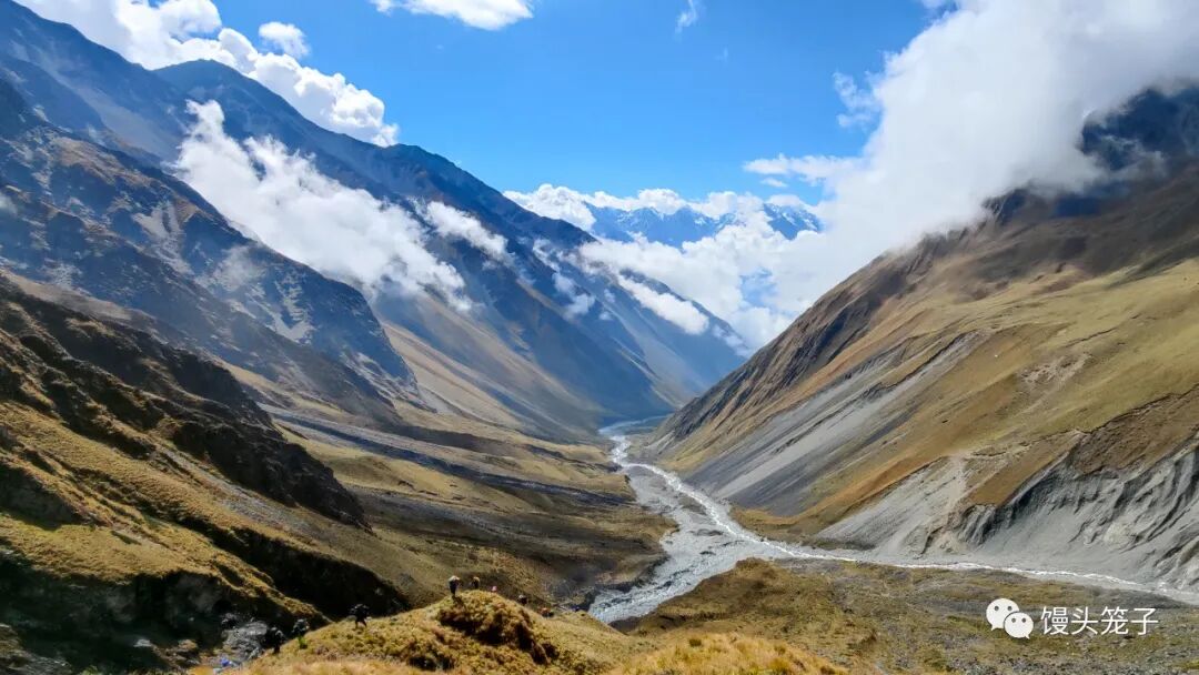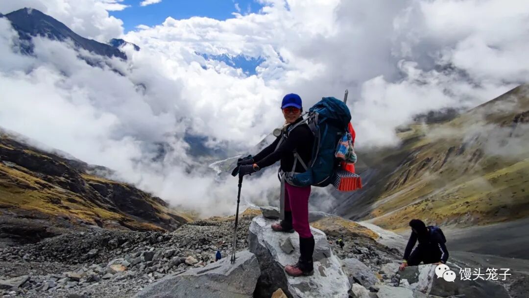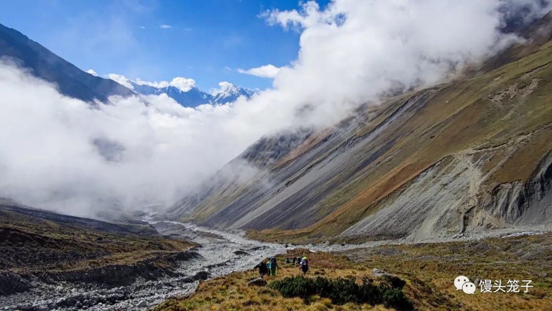 今天是背夫陪伴我们的最后一天,还能享受轻装。回头,大本营已经缩成一个白点。云海悄悄地跟在我们身后,催着我们往前赶路。