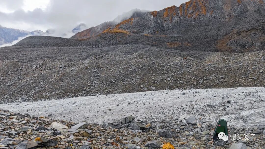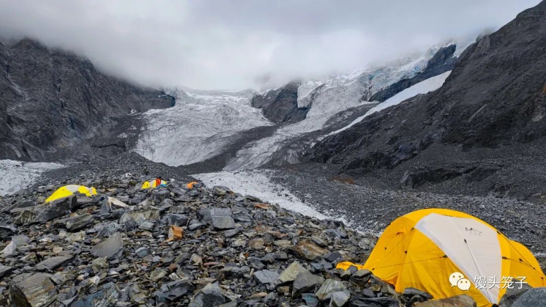 营地左右都是露头的冰川。上面这张图右下角,应该是整个营地最重要的帐篷了--厕所。在刺骨的寒风中,你绝对不想把屁屁光在外面太久的。在高海拔大大,更要命的是稀薄的氧气,大的时候稍微使点儿劲,就会把自己憋得天昏地暗。多亏了这厕所,我规律的肠胃运动一直保持到了现在。不过这苦命的孩子当晚就被呼啸的南风,吹上了天。还好,粑粑们都老老实实呆在石头之间,没有给我们来一个天降甘霖。