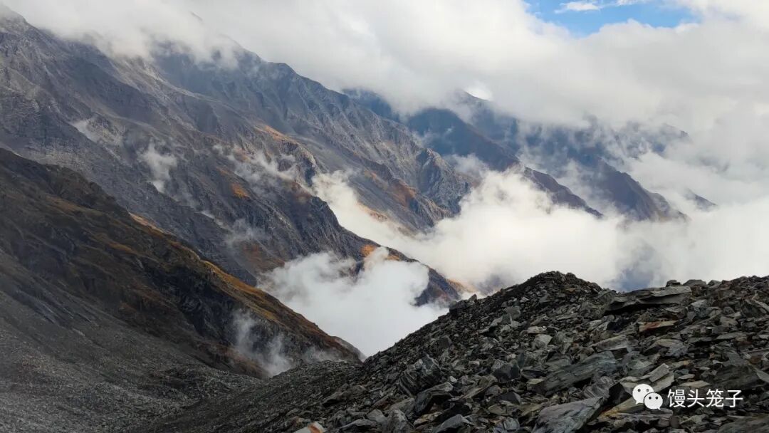 跨过最后一片河滩石,终于告别陪伴我们三天的小河。云海已经摸到了我们脚后跟。
