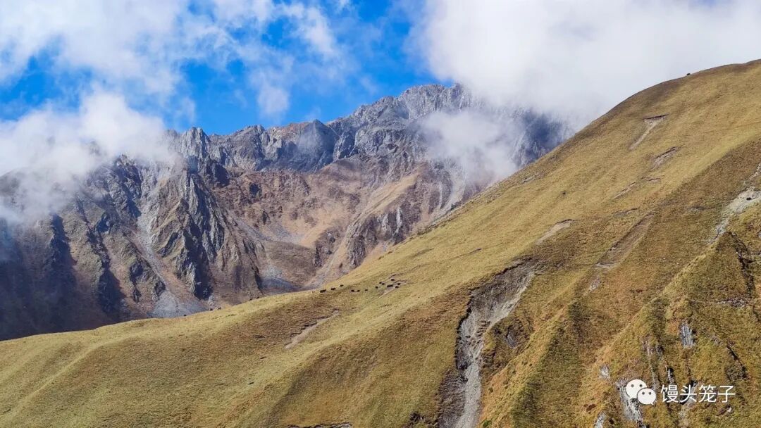 抬头往左,对面的山脊冒出来一群牦牛。少超从成都出发时就心心念念这群牛。上次他下山的时候给牛倌说好了。十一的时候要在大本营杀一头牦牛。一路上就跟我们算,这几百斤肉得怎么吃。估计他和牛倌的话不小心被牛群听去了。这不,躲的这么远。