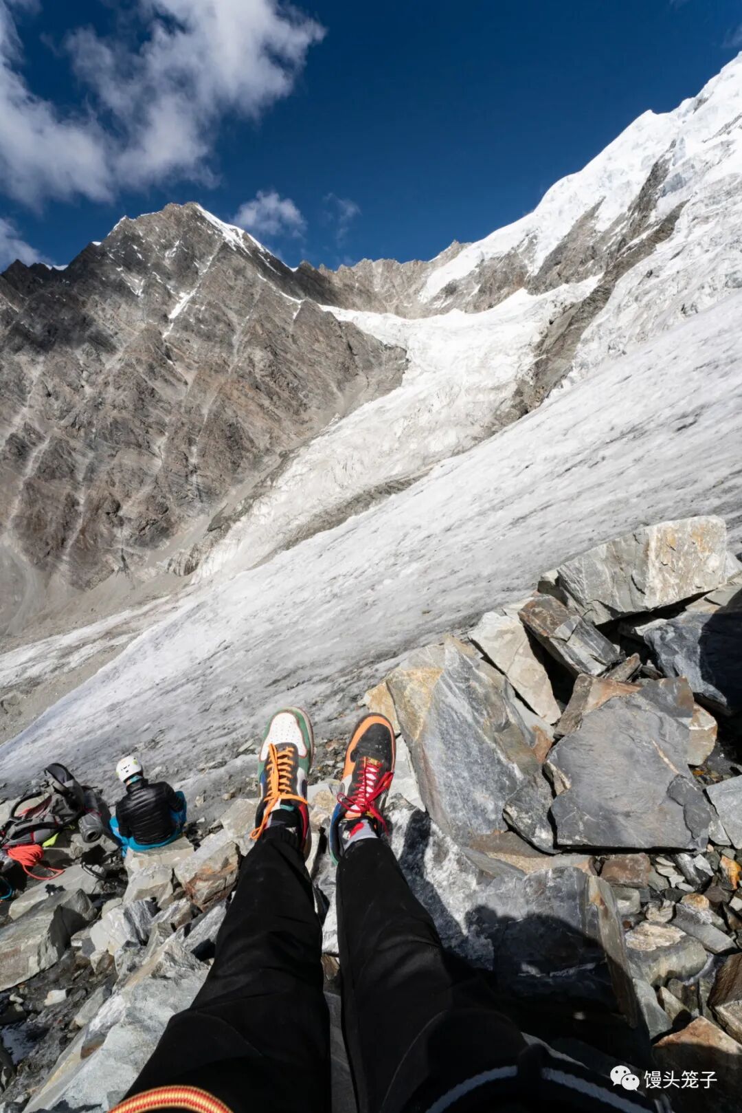 周T应该是我们队伍里最有仙气的人了。上面这双鞋就是我对他的第一印象。中年人的我,第一反应是这兄弟怎么把鞋都穿混了呢?后来,这兄弟居然把这双鞋一直穿到了峰顶。高山靴是什么?在周T面前就是渣,一双耐克就好了。大本营拉练那天是个大太阳,防晒霜把脸涂白的老年组,用目光恭送周T打着一把黑伞,蹦蹦跳跳的上了碎石坡顶。登顶那天我们一直调侃周T,说他应该把他穿这双鞋登顶的视频发给耐克。广告费至少得6位数吧。