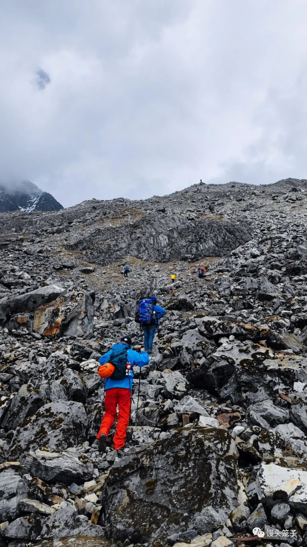 过了干肺坡的草甸,再往上就是这样的石头坡了。虽然比起第二天我们会遭遇的碎石坡,这里真的是小意思。但是松松垮垮,无处安放的碎石的确给我们带来了很多麻烦。尤其是路上人多的时候,上面的人不小心碰下来的石头还是很危险的。我的小腿就在这里被滚下来的小石头砸破了皮。还好,石头不大,血一会儿就自己止住了。
