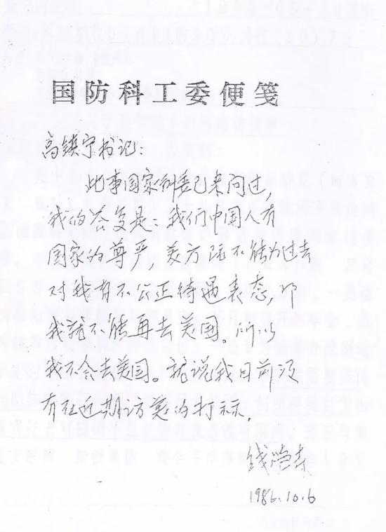 1986年,美国政府邀请钱学森访美,试图以民间方式弥补过去对他的不公正待遇,但政府不愿作出表态。钱学森回复说:“我们中国人有国家的尊严,美方既不能为过去对我有不公正待遇表态,那我就不能再去美国。”